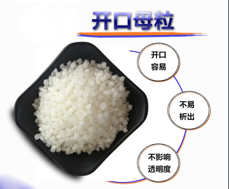 開口母粒是多種高效的專用助劑進行復配,經特殊工藝加工而成。可用于聚烯烴(PE、PP)塑料的加工,能有效地提高制品的開口(即抗粘連)性能及加工過程的潤滑性能。